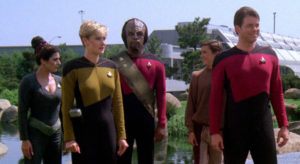 Dass sich The Next Generation sich zu Beginn in vielerlei Hinsicht noch sehr an der Mutterserie orientierte, erwies sich als zweischneidiges Schwert. Das zudem an Modetrends der 1980er angelehnte Kostümdesign war aus meiner Sicht teilweise wirklich einfach furchtbar. Damit meine ich nicht die in den ersten beiden Staffeln noch einteiligen Uniformen oder die nostalgischen Uniform-Kleidchen, sondern vielmehr die Zivilkleidung einiger Nebenfiguren wie etwa in Begegnung mit der Vergangenheit (We’ll Always Have Paris). Es sollte auch etwas dauern bis sich TNG von TOS musikalisch abnabeln sollte. Die kultige TNG-Titelmelodie setzt sich aus dem Beginn von Alexander Courages Thema der Originalserie und Jerry Goldsmiths Intromusik zum ersten Kinofilm zusammen. Mit der dritten Episode Gedankengift (OT: The Naked Now), in welcher die Besatzung plötzlich wie betrunken und enthemmt agiert, gibt es sogar eine gelungene, direkte Hommage an eine Folge der Originalserie, nämlich Implosion in der Spirale (OT: The Naked Time; Staffel 1, Folge 4).