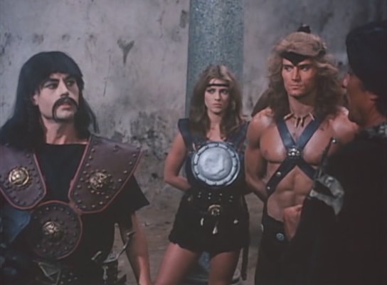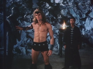 Leider hält sich die unfreiwillige Komik in Grenzen, auch wenn es schon ziemlich hirnverbrannt ist, was einem hier vorgesetzt wird. Da wird zu Beginn der Held Ator als der stärkste und beste von allen angepriesen. Er ist nicht nur sehr stark und macht Bodybuilding mit riesigen Felsbrocken, sondern auch in diversen Wissenschaften mehr als bewandert. Mit einem Holzhammer von der Größe, bei welcher Donnergott Thor passen würde, wird also dem Zuschauer eingebläut, dass Ator einfach der perfekte Tausendsassa ist. Das sich der muskelbepackte und optisch an He-Man erinnernde Heros aber von einer Gruppe Dorfbewohner überlisten lässt und die halbe Filmlänge über gefesselt bleibt, ohne auch nur einen müden Befreiungsversuch zu unternehmen, lässt sich nicht mehr als kleiner Anschlussfehler abtun. So schaut Ator einfach nur versteinert zu, als die Dorfbewohner massakriert und seine Mitgefangenen nacheinander einem Schlangengott geopfert werden. Das große Ungetüm darf Ator freilich dann kaltmachen, wobei Darsteller Miles O’Keeffe einfach mit einem riesigen Stoffwurm (?) ringt, der etwa so beweglich ist wie der Riesentintenfisch in Ed Woods Die Rache des Würgers.
