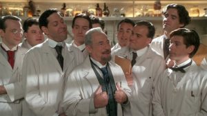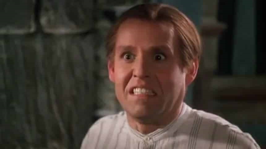 Brooks hatte damals natürlich sämtliche Möglichkeiten der Gestaltung seiner Version des berühmt-berüchtigten Vampirfürsten und nutzte diese auch aus. Rein inhaltlich orientierte sich Tot aber glücklich direkt am ersten Tonfilm von 1931 von Tod Browning mit einem gewissen Bela Lugosi in der Hauptrolle. Leslie Nielsen hatte natürlich keinesfalls die Ausstrahlung des geheimnisvollen Mimen aus Ungarn, aber lehnt er seine Performance deutlich an Lugosi an und trägt im Grunde auch das gleiche Kostüm. In gleicher Weise „kopiert“ Peter MacNicol (Addams Family in verrückter Tradition, Ally McBeal) gekonnt die Darstellung von Dwight Frye, dem Renfield aus Brownings Version. Da ich den alten Film kürzlich erst gesehen hatte fiel mir bei der Sichtung auf, wie oft Mel Brooks hier Szenen und Kameraeinstellungen aus dem 1931er Film übernimmt oder parodiert.