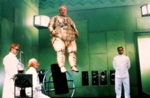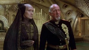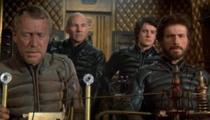 Bei der kürzlichen Wiederholungssichtung war ich erstaunt wie gut die Adaption von Herberts Buch doch über weite Strecken funktioniert. Unter den Kinobesuchern verteilte man damals übrigens „Spickzettel“, auf welchen wichtige Begriffe und Namen erklärt wurden. Natürlich ist es sehr wahrscheinlich, dass man völlig ohne Vorkenntnisse dem Film nur schwer folgen kann. Lynch gelingt es aus meiner Sicht aber, die elementaren Details der Geschichte zu vermitteln. Die unterschiedlichen tonangebenden Parteien dieser fernen Welt werden gekonnt in Stellung gebracht: der scheinbar über allem thronende Imperator, die Schwesternschaft der Bene Gesserit (einem Hexenorden, der durch ein Zuchtprogramm den perfekten Übermenschen erschaffen will), die Adelshäuser Harkonnen und Atreides (welche beide mit der Förderung des Spice betraut werden) und natürlich die wahre Macht im Universum, die überaus einflussreiche Raumfahrtgilde, deren Navigatoren durch den Konsum von Spice deformiert werden und deren Leben gleichzeitig verlängert wird. Mit den in einigen Szenen aus dem Off eingestreuten Gedanken der Figuren wird eine besondere Nähe zum Roman hergestellt und die Zeit effektiv genutzt, um die Story voranzubringen.