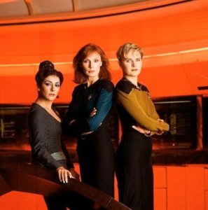 Dass sich The Next Generation sich zu Beginn in vielerlei Hinsicht noch sehr an der Mutterserie orientierte, erwies sich als zweischneidiges Schwert. Das zudem an Modetrends der 1980er angelehnte Kostümdesign war aus meiner Sicht teilweise wirklich einfach furchtbar. Damit meine ich nicht die in den ersten beiden Staffeln noch einteiligen Uniformen oder die nostalgischen Uniform-Kleidchen, sondern vielmehr die Zivilkleidung einiger Nebenfiguren wie etwa in Begegnung mit der Vergangenheit (We’ll Always Have Paris). Es sollte auch etwas dauern bis sich TNG von TOS musikalisch abnabeln sollte. Die kultige TNG-Titelmelodie setzt sich aus dem Beginn von Alexander Courages Thema der Originalserie und Jerry Goldsmiths Intromusik zum ersten Kinofilm zusammen. Mit der dritten Episode Gedankengift (OT: The Naked Now), in welcher die Besatzung plötzlich wie betrunken und enthemmt agiert, gibt es sogar eine gelungene, direkte Hommage an eine Folge der Originalserie, nämlich Implosion in der Spirale (OT: The Naked Time; Staffel 1, Folge 4).