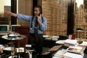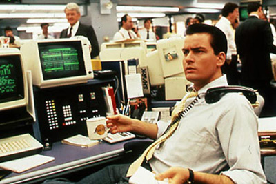 Bud Fox an seinem Arbeitsplatz. Man beachte insbesondere die für die damalige Zeit modernen Computer.