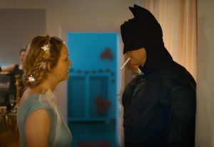 Bereits nachdem die beiden Protagonisten das Kino aus der Anfangsszene verlassen haben beginnt Zwei im falschen Film seinen herrlich schräg-minimalistischen Charme zu entfalten. Als quasi dritte Hauptfigur fungiert das Auto von Hans und Heinz, ein alter Golf GTI aus den 1980ern, der noch dazu die durch den berühmten Renn-Käfer namens Herbie bekannte Nummer 53 trägt. Dass dieses nostalgische Gefährt öfter mal Schwierigkeiten beim Anspringen hat und zudem der Rückwärtsgang nicht mehr funktioniert, lässt sich als klares Symbol für die recht festgefahrene Beziehung seiner Besitzer interpretieren. Der Kassettenspieler hängt und spielt unentwegt (I’ve Had The) Time of my Life aus Dirty Dancing. Auch sonst bietet Lackmann hier trocken-absurde Situationen und nüchtern agierende Figuren mit leicht überspitzten „Grautönen“. Während Laura/Heinz ursprünglich Schauspielerin ist und ihr Geld mittlerweile als Sprecherin einer Zeichentrickampel verdient betreibt Hans mit seinem besten Freund Florian (David Bredlin) einen Kopierladen, dessen Arbeitskleidung Hans auch fast durchgehend in seiner Freizeit trägt, die ihn wie einen Retro-Proll aussehen lässt. Das titelgebende Paar wohnt zudem direkt über dem Copyshop. Diese Wohnung wirkt eher wie ein notdürftig umfunktioniertes Großraumbüro mittlerer Größe, ein dauerhaftes Provisorium. Perfektes Zusammenwirken von Setting und Charakteren.