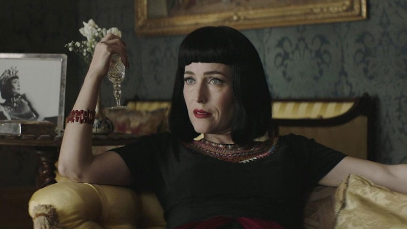 Als klassisches Whodunit-Beitrag wirkt die ganze Angelegenheit im besten Sinne altmodisch oder etwas aus der Zeit gefallen. Eigentlich erstaunlich, dass der Roman noch nicht vor gut 30 bis 40 Jahren adaptiert wurde, in einer Zeit als Agatha Christie im Kino ein Synonym für stargespickte Krimikost war (siehe Mord im Orientexpress von 1974, Tod auf dem Nil und Das Böse unter der Sonne). Vermutlich weil hier keiner der beiden Zugpferde Marple und Poirot ermittelt, sondern mit Charles Hayward ein „herkömmlicher“ Privatdetektiv, der zudem persönlich in den Fall involviert ist, weil er mit der Enkelin des Mordopfers eine Beziehung hatte. Hauptdarsteller Max Irons (Die Frau in Gold) bleibt in seiner Rolle als junger „Sleuth“ zugegebenermaßen eher blaß, was sich jetzt aber nicht wirklich negativ auf das Gesamtpaket auswirkt. Die schauspielerischen Glanzlichter dürfen andere setzen. Zum einen natürlich die sechsfach Oscar-nominierte Glenn Close (Albert Nobbs, Guardians of the Galaxy, Die Frau des Nobelpreisträgers) als zwar nach außen freundliche, aber scharfzüngige Hausherrin Lady Edith, die der Maulwurfplage im eigenen Garten mit der Schrotflinte zu Leibe rückt. Mein persönliches Highlight war allerdings die zwar nicht sehr umfangreiche aber doch eindrucksvolle Performance von Gillian Anderson (Akte X, The Fall) als Sophias exaltierte Mutter Magda, die als erfolglose Provinzschauspielerin mit Starallüren gleichsam eine verkrachte Existenz darstellt wie ihr Ehemann Philip, ein im Grunde bedeutungsloser Historiker. Auch die beiden anderen „Serienstars“ Amanda Abbington (Sherlock) als resolute Gattin des zweiten Leonides-Sohns Roger, und Christina Hendricks (Mad Men) als naive, junge Witwe des Toten, die für alle anderen Familienmitglieder natürlich als Hauptverdächtige feststeht, können überzeugen.