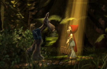 Dem Zielpublikum zuliebe wurden die Märchenfiguren etwas umgestylt. Der Wolf trägt ein lässiges Sport-Outfit und Rotkäppchen peppt ihren roten Umhang mit einer Schlagjeans auf.