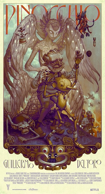 Originalsprecher: Gregory Mann (Pinocchio, Carlo), David Bradley (Geppetto), Ewan McGregor (Sebastian J. Cricket), Ron Perlman (Podestà), Finn Wolfhard (Candlewick), Christoph Waltz (Count Volpe), Cate Blanchett (Spazzatura), Tilda Swinton (Wood Sprite/Death), Tim Blake Nelson (Black Rabbits) u.a. Nach Die Abenteuer des Pinocchio von Carlo Collodi. Drehbuch: Guillermo del Toro und Patrick McHale. Regie: Guillermo del Toro und Mark Gustafson.