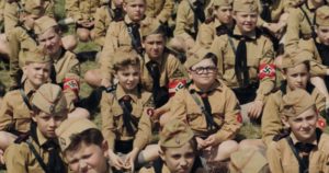 Es gibt wohl kaum einen Spielfilm, in welchem der Hitlergruß so inflationär gebraucht wird wie hier. Zu Beginn üben Jojo und sein imaginärer Freund die berüchtigten Worte gleich kräftig ein bevor der Junge während des Vorspanns (unterlegt mit Komm, gib mir deine Hand von den Beatles) „Heil Hitler-„rufend durch die ganze Stadt rennt. Doch hält der Film diesen absurd-überzeichneten Humor nicht über die ganze Laufzeit aufrecht. Im Verlauf der Handlung wird die ganze Angelegenheit für den jungen Helden und folglich auch die Zuschauer nämlich zunehmend ernst. Mit der Zeit verschwindet auch Jojos eingebildeter Freund und eine andere (reale) Person tritt quasi an dessen Stelle.