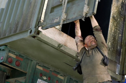 Underworld-Regisseur Len Wiseman stellte sich der Aufgabe, dem verschollenen Titanen des Actionkinos wieder zu alter Größe zu verhelfen. Anders als im dritten Teil Stirb Langsam – Jetzt erst recht gerät McClane wieder völlig zufällig zwischen die Fronten, genauer gesagt zwischen die Terroristen und das, was sie wollen. Doch an einigen Punkten, die den dritten Film meiner Meinung nach zum besten der Reihe machen, orientiert sich Stirb Langsam 4.0 stark: es gibt wieder einen Co-Helden wie damals Samuel L. Jackson. Natürlich nicht so kongenial und bockig, sondern eher hypochondrisch und verweichlicht, doch ebenso wie Zeus bringt Matthew statt Coolness Intelligenz in die kurzfristige Partnerschaft ein, die McClane dieses Mal dringender braucht als je zuvor. Denn von geschlossenen Schaltkreisen, abgestellten Satelliten und Algorithmen weiß er jetzt nicht so viel – dafür aber, wie man einen Helikopter mit einem Auto aus der Luft holt. Der Schauplatz ist in Stirb Langsam 4.0 ebenfalls nicht so eng gefasst wie im zweiten oder gar im ersten Teil, sondern ähnelt auch hier Stirb Langsam – Jetzt erst recht, wobei allerdings auch nicht mehr eine Stadt ausreicht, sondern gleich mehrere Staaten herhalten müssen. Sehr angenehm ist, dass nicht wie im zweiten oder teilweise noch im dritten Teil immer wieder die früheren Heldentaten von John McClane erwähnt werden, ganz im Gegenteil wird hier eher damit gespielt, dass niemandem mehr im Bewusstsein ist, welcher berühmte Detective da vor ihm steht (Matt: „Sie sind so ruhig. Haben Sie so was schon mal gemacht?“). Außerdem wird, wie auch in anderen Filmen zur Zeit (z.B. Ocean’s Thirteen) die Ebene der Schauspieler parodiert, wenn McClane sagt: „Von mir aus kann gern jemand anderes den Helden spielen“, aber nein, es gibt keinen besseren Helden als Bruce Willis alias John McClane. Niemand sagt mit einem Blick so viel, und wenn doch mal spricht, dann in typisch trockener Einsilbigkeit. Niemand überlebt so viel und trägt dabei noch so viel Blessuren davon, denn anders als manche Helden ist McClane eindeutig nicht unverwundbar und ist auch am Ende des vierten Teils mehr kaputt als ganz. Niemand oder besser gesagt kein Mann wirkt auch dann noch sympathisch, wenn er eine Frau verprügelt. Einen Unterschied gibt es allerdings: das obligatorische Unterhemd fehlt! Da dabei jedoch die spannendste Frage sowieso immer nur war, warum genau McClane sich ausziehen muss, ist diese Änderung leicht zu verschmerzen, noch dazu weil es durch ein weitaus ästhetischeres Hemd ersetzt wird. Eine nette Überraschung ist McClanes Tochter Lucy (Mary Elizabeth Winstead), die eindrucksvoll Newtons Apfel-Theorie beweist und ähnlich wir ihre Mutter in den beiden ersten Teilen zwar in der Hand der Terroristen, jedoch keinesfalls deren Spielball ist.