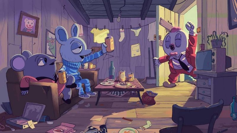 In welche Richtung der dritte abendfüllende Film von Alberto Vázquez (geboren 1980), der auch als Comic-Künstler arbeitet, geht enthüllt schon der Titel, welcher übersetzt Bühnenbild oder Kulisse bedeutet. Die mit anthropomorphen Tieren bevölkerte Welt als Theaterbühne, welche immer wieder ins Schaurige und Absurde abdriftet. Kein Wunder, dass der Protagonist in Mausgestalt mit seinem trostlosen Leben als unglücklicher Arbeitsloser hadert und seine berechtigterweise schlechte Laune auch Auswirkungen auf seine Gattin hat. Eine kuriose Mischung aus The Truman Show (1998) von Peter Weir und Szenen einer Ehe (1973) von Ingmar Bergman, mit Motiven aus Franz Kafkas Roman Das Schloss (1926). Und all das spielt sich in einer Zeichentrickwelt ab, die nicht von ungefähr an bekannte Disneyfiguren und klassische Cartoons erinnert.