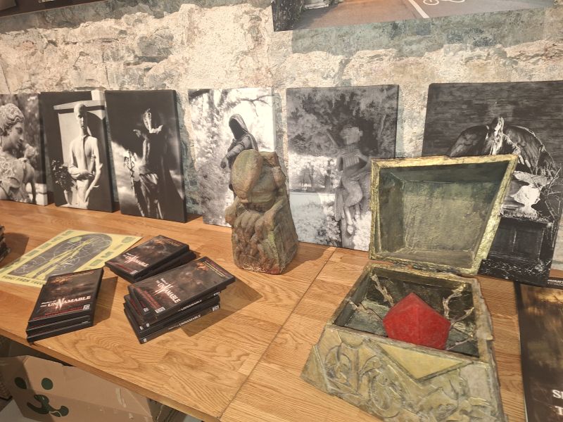 Sascha Renninger war auch persönlich bei der Vorstellung Filmwochenende anwesend, gemeinsam mit seinem Hauptdarsteller Oliver Meiners, Komponist Klaus von Heydenaber und Sounddesigner Hamed Jalali, wobei sich manche der vier Männer an diesem Abend das erste Mal persönlich trafen. Die Crew beantwortete Fragen aus dem Publikum. Der Regisseur hatte auch ein paar Requisiten aus dem Film mitgebracht (siehe Foto oben) und erzählte von der langwierigen Arbeit an seiner dritten Lovecraft-Adaption. Unter dem gleichen Titel Haunter from Beyond plant Sascha seine drei Werke zu einem abendfüllenden Spielfilm zusammenzufügen und mit einer Rahmenhandlung auszustatten. Hoffentlich dauert es nicht wieder acht Jahre bis zur nächsten Premiere.
