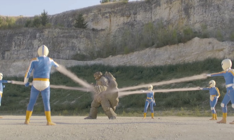 Ohne jetzt Dupieuxs Œuvre (mit Ausnahme von Flat Beat) zu kennen hätte ich jetzt nicht damit gerechnet, dass der Franzose einen klassischen Vertreter dieses Genres abliefert. Smoking Causes Coughing dekonstruiert die üblichen Zutaten vielmehr und kombiniert diese mit gruseligen Geschichten, welche sich die Mitglieder des Vigilanten-Teams bei der gemeinsamen Auszeit gegenseitig erzählen. Statt ausufernder (um nicht zu sagen ermüdender) Actionszenen wie bei Marvel und Konsorten wird das Szenario immer wieder entschleunigt, etwa durch die zwischenzeitlich eingestreuten Gruselstories, die etwas wirken, als habe Dupieux die eher dünne Haupthandlung mit anderen Ideenschnipseln halbwegs auf Spielfilmlänge gestreckt.