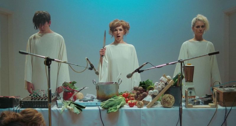 Bei Flux Gourmet ist die hiesige Obskurität allerdings nicht wirklich verwunderlich, denn sowohl thematisch als auch inszenatorisch präsentiert sich das Werk als sehr speziell. Strickland begibt sich hier in die Welt der Performance-Kunst. Vor gut zwei Wochen war ich selbst auf einem kleinen Festival für experimentelle Musik und Klangkunst. Dort hantierten die Musiker*innen unter anderem mit Elektronik und Wasser oder unterschiedlich klingenden Metall-Konstruktionen. Fügt man die Zubereitung von Essen als weiteren Faktor hinzu, so kommt man auf die Arbeit der hier gezeigten Gruppe, welche Kochkunst, elektronische Noise-Musik und grenzüberschreitende Performance vereint.