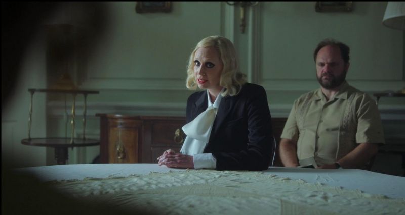 Die teils von kindischen Machtspielchen forcierten Konflikte innerhalb der Gruppe und mit der Institutsleiterin sorgen allerdings für eine herrlich absurd-komische Dynamik, auch gepaart mit den gesundheitlichen Problemen des dokumentierenden Schriftstellers, welcher die ganze Geschichte in seiner griechischen Muttersprache auch aus dem Off erzählt. Trotz seiner wenig massentauglichen Thematik ist es dem Regisseur erneut gelungen, namhafte Schauspieler*innen zu gewinnen. Allen voran natürlich Gwendoline Christie (Game of Thrones), die bereits in Das blutrote Kleid mitwirkte, als eigensinnige Direktorin Jan Stevens und Asa Butterfield (Sex Education) als etwas desinteressiert wirkender Billy. Die stärkste Performance gelingt aus meiner Sicht Stricklands Stammschauspielerin Fatma Mohamed als exzentrische Diva Elle di Elle. Und die zweite Hauptrolle spielen die irre auffälligen und teils albernen Kostüme von Jan Stevens, welche Gwendoline Christie noch größer wirken lassen als sie ohnehin schon ist.